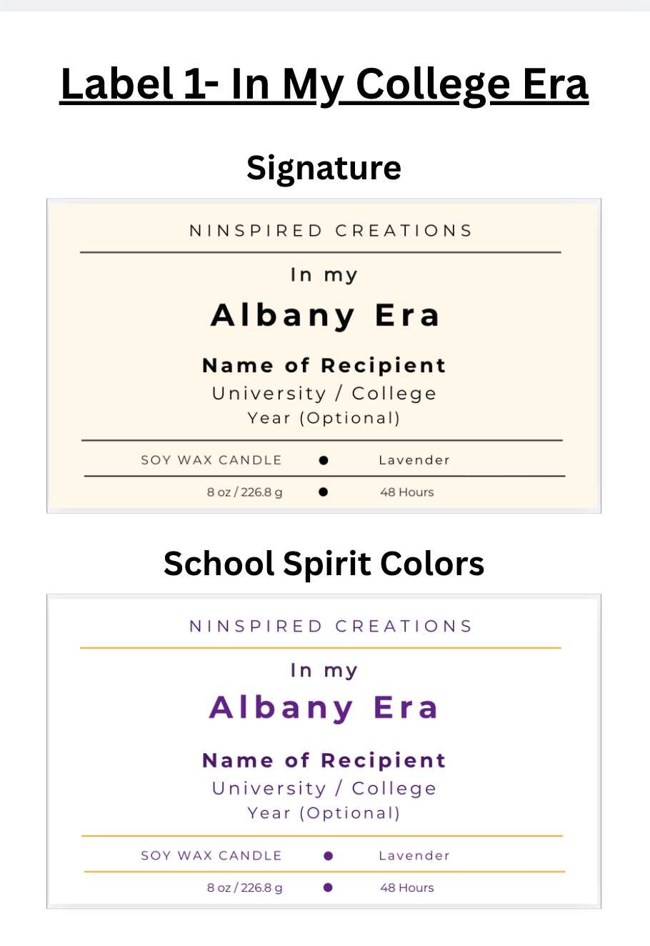 - Ivory label with college-color accents