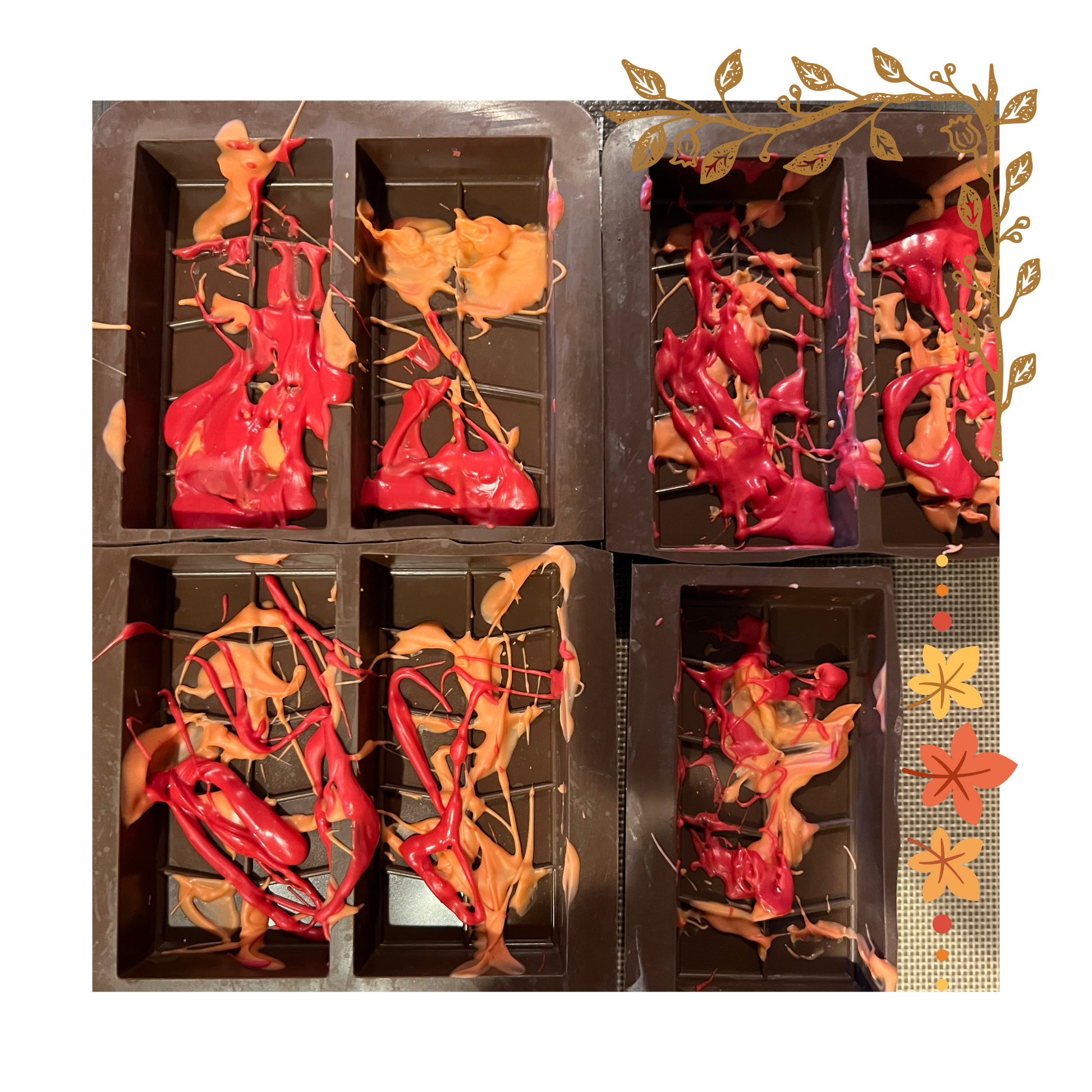 Available in dark chocolate, milk chocolate or white chocolate (in fall colors).